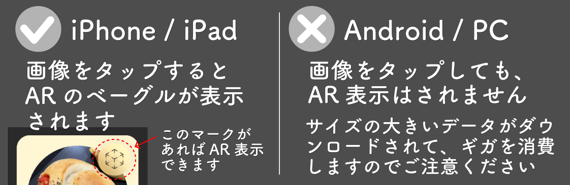 iPhoneとiPadでベーグルたちをARコンテンツとして表示させることができます。